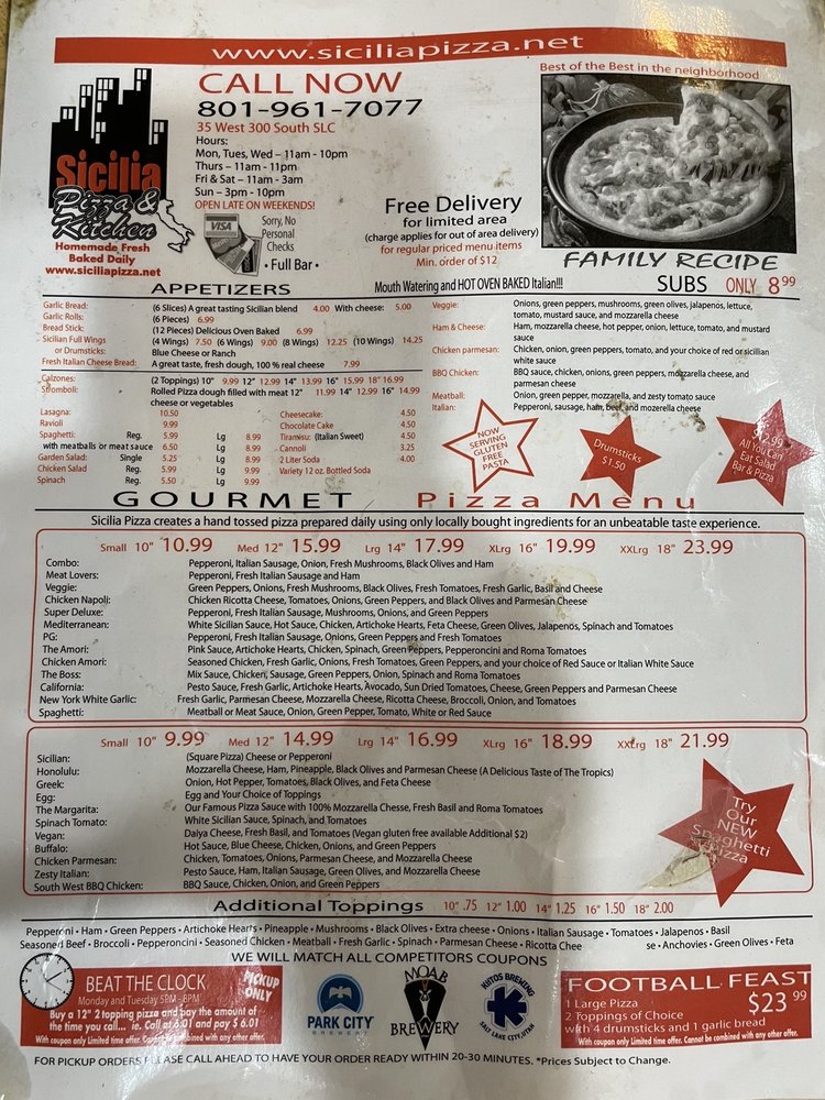 Welcome to Sicilia Pizza & Kitchen, an Italian gem nestled in Salt Lake City. Here, you'll discover a menu brimming with delightful options that span pizza, sandwiches, and scrumptious pastas. The focus on quality shines through in their thin-crust pizzas, which have garnered rave reviews for their unique flavor and perfect crispness.